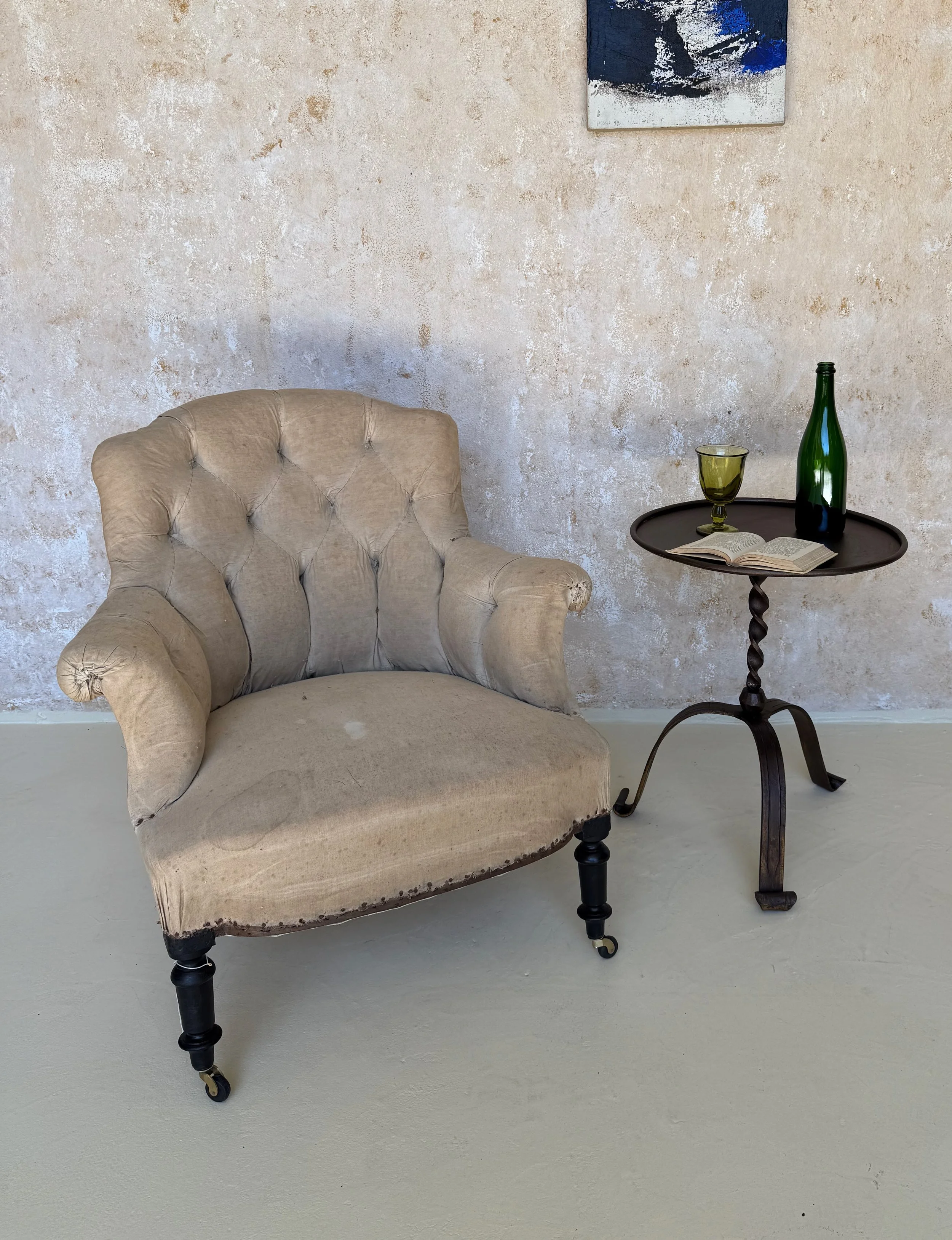 These small scale French Napoleon III armchairs feature gracefully curved arms and “chapeau de gendarme” backs that provide superior lumbar support and comfort. The intricate diamond tufting and lovely turned legs are elegant examples of classic Napoleon III design. We have added casters to provide optimal pitch and relaxation, and to facilitate effortless movement within any space.